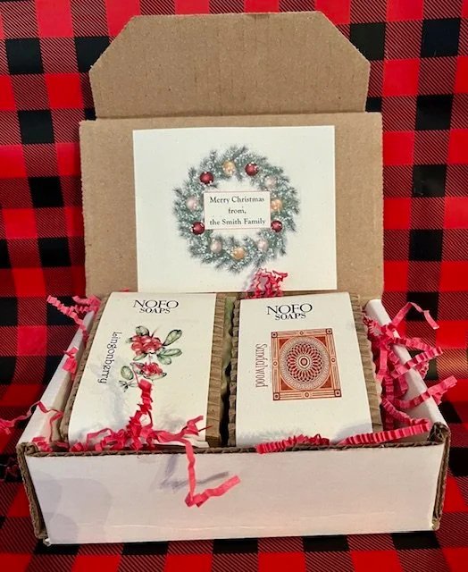 NOFO will gladly ship a Holiday NOFO Gift Box to out of town friends and family The price includes: two bars of soaps (your choice), a personalized greeting, holiday packaging, and a trip to the post office for you. To order: